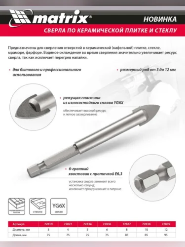 Сверло по керамике 8.0мм MATRIX MATRIX 72837 в Перми Пермском крае