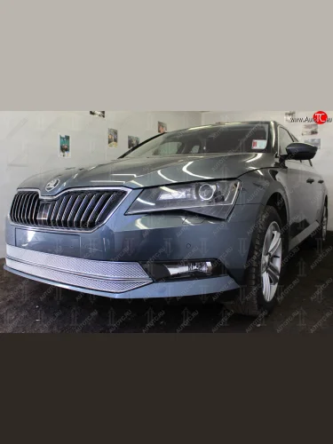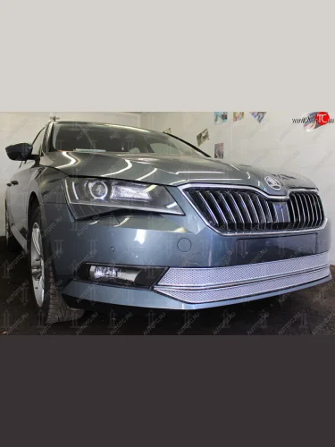 Защитная сетка в бампер (низ, 2 части, ячейка 4х10 мм) Стрелка11 Премиум Skoda Superb B8 (3V5) универсал дорестайлинг (2015-2019) (Хром) в Перми Пермском крае
