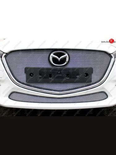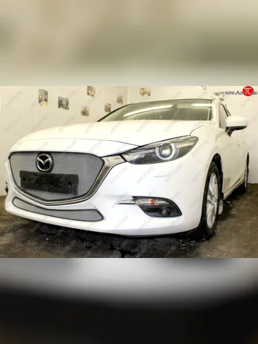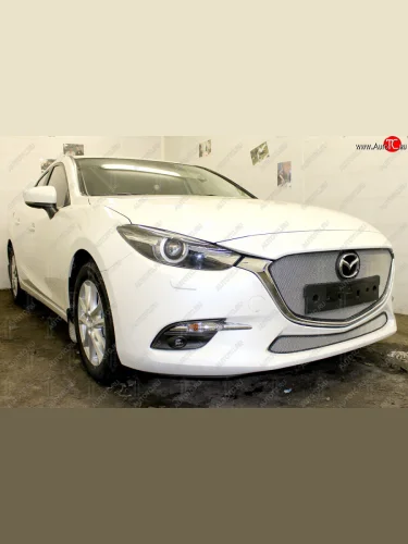 Защитная сетка в бампер (верх, ячейка 3х7 мм, с рамкой под номер) Alfeco Стандарт Mazda 3/Axela BM рестайлинг, хэтчбэк (2016-2019) (Хром) в Перми Пермском крае