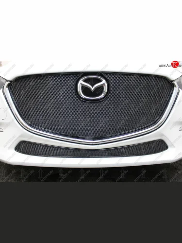 Защитная сетка в бампер (верх, ячейка 4х10 мм, без рамки под номер) Alfeco Премиум Mazda 3/Axela BM рестайлинг, хэтчбэк (2016-2019) (Чёрная) в Перми Пермском крае